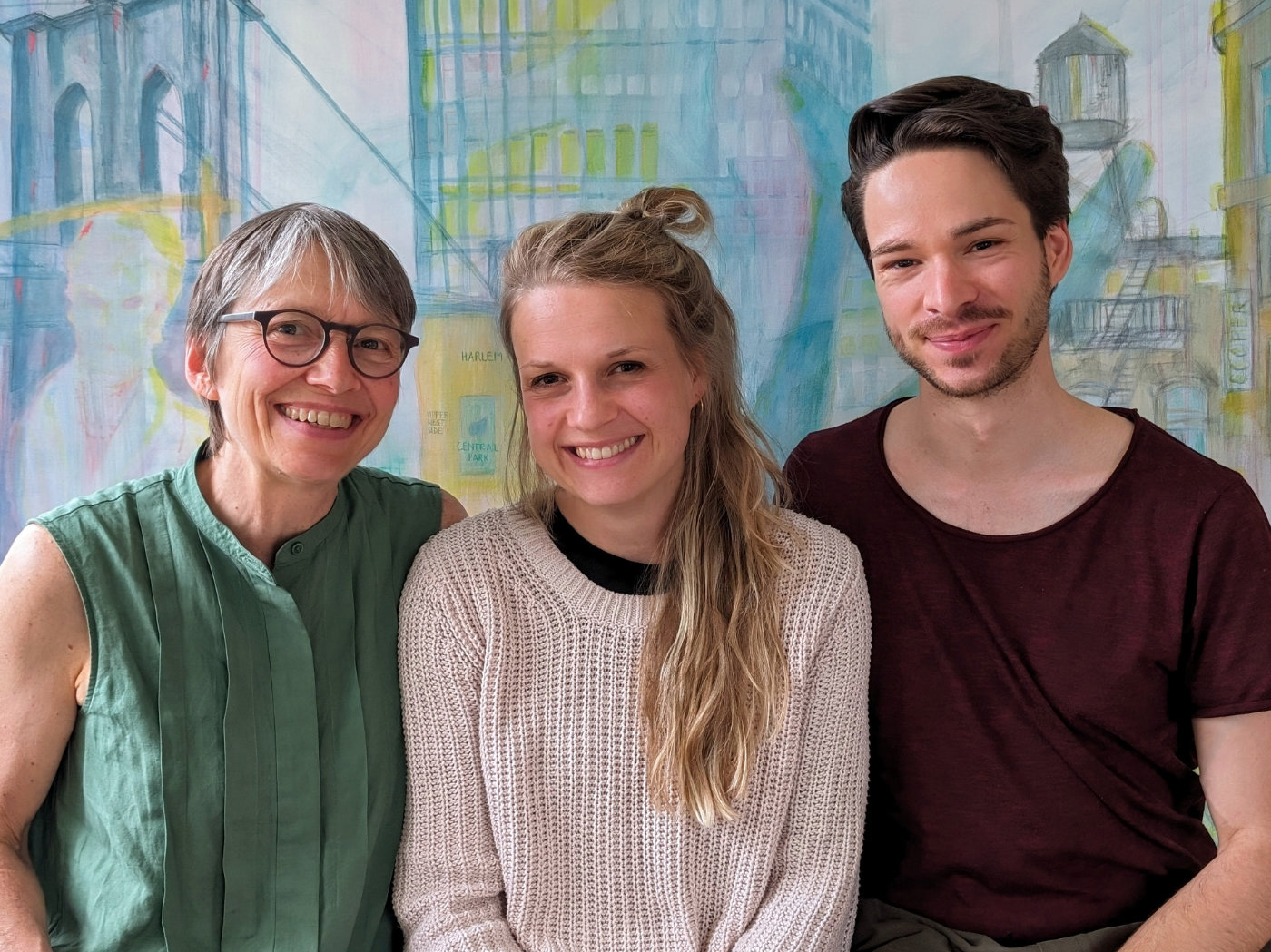 Sabine, Tabea und Elias vor einem großformatigen Werk von Sabine Herbst. Foto von André Herbst 2024.